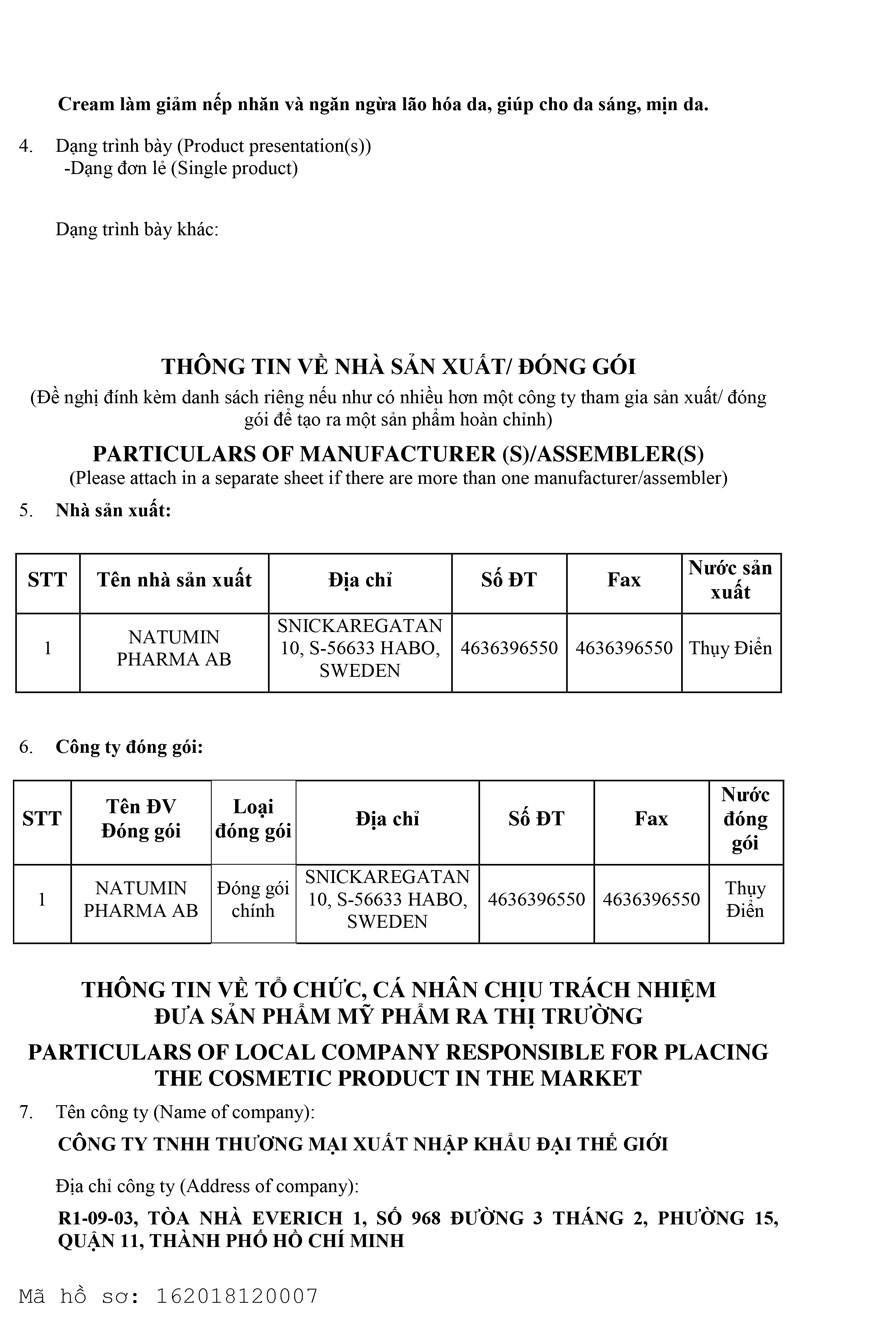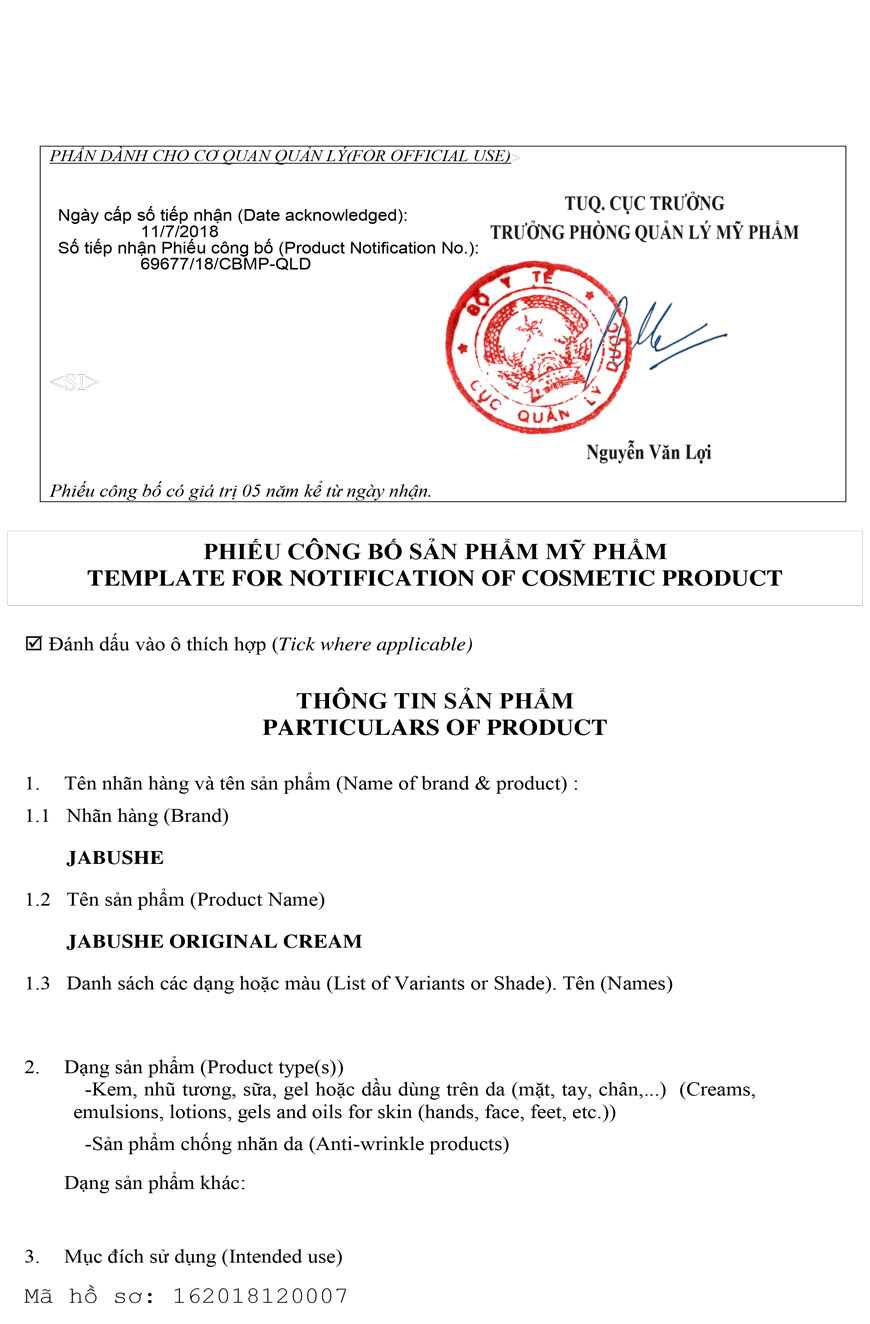 GIẤY CHỨNG NHẬN: Jabushe Original Cream 50 ml